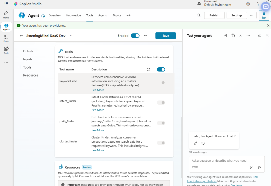 MCPサーバーがエージェントに追加されると、サーバーが提供するすべてのツールがデフォルトでON状態になります。
