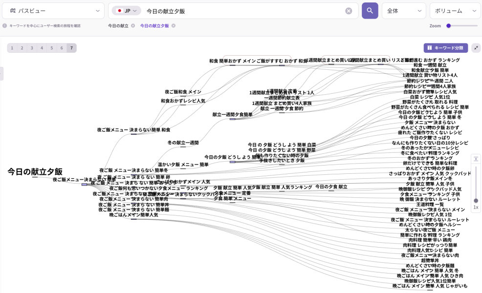 このように、検索語を単体で見るのではなく、その前後でどのような語に関心が広がっているかを見ることで、アンケートやインタビューだけでは拾いにくい生活者の無意識の判断材料が見えやすくなります。消費者インサイトを発見する第一歩は、まずこうした行動データのつながりを丁寧に捉えることです。<パスファインダーの機能紹介>