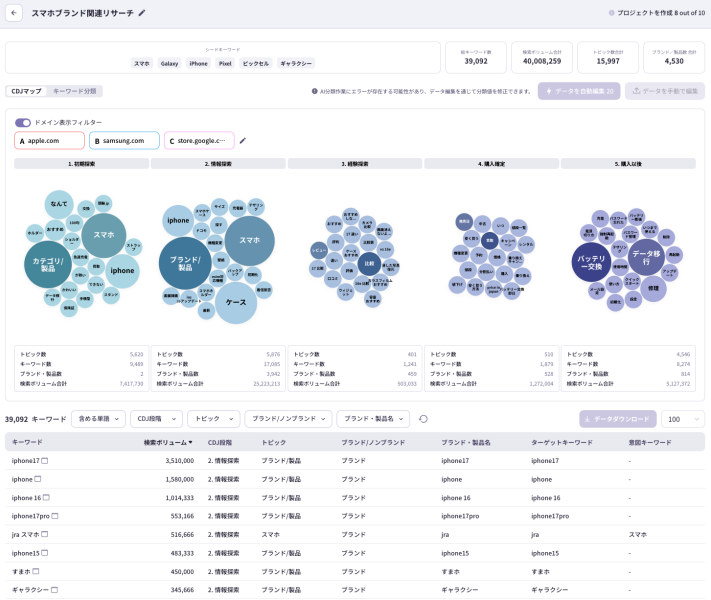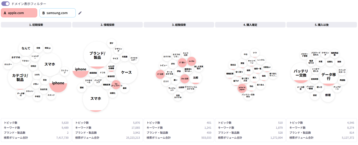 キーワードを入力するだけで、関連検索語を瞬時に収集・分類し、顧客がどのように情報を探索し、購入を決定するかを段階的かつ定量的に示します。これにより、以下のことが一目で理解できます。