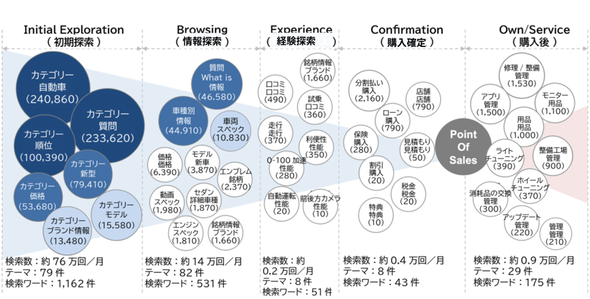 検索データをもとにしたインサイトは、以下のように消費者の購買段階や気持ちを詳細に把握するために活用できます。