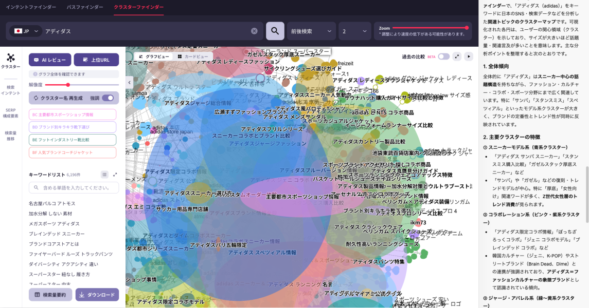 - アディダス関連キーワード約6,000件、約70のクラスターを自動分類