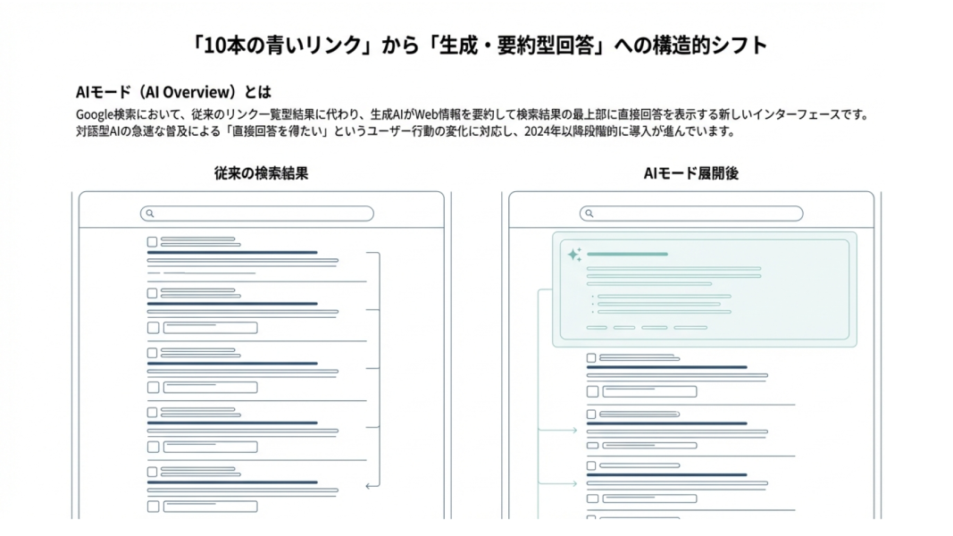 従来のGoogle検索は、検索クエリに対してWebページのリンク一覧(10本の青いリンク)を表示する形式でした。AIモードでは、これに加えて(またはこれに代わって)生成AIがWebの情報を要約した回答を検索結果の上部に直接表示します。
