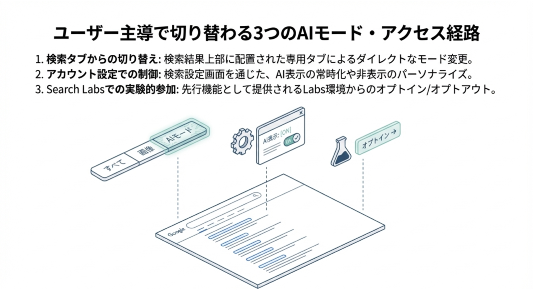 AIモードの切り替え方法は、「検索結果ページ上部のタブ切り替え」「Google検索設定での変更」「Labs(実験的機能)からのオプトイン/アウト」の3つです。