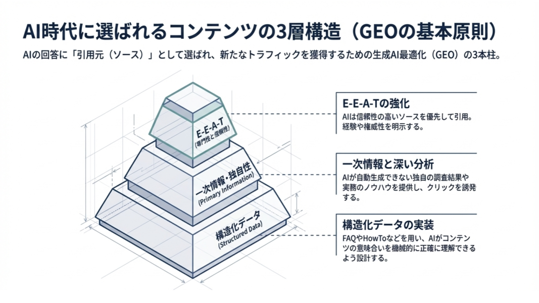 - E-E-A-Tの強化、構造化データの実装、一次情報の提供がAI検索時代の鍵である