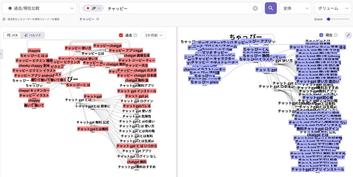 【ヒント】過去の検索経路と比較することで、AI検索の普及に伴い消費者の検索行動がどう変化しているかを確認できます。リスニングマインドの過去比較機能では、現在と過去の検索経路を比較し、こうした変化を可視化できます。<過去比較機能の紹介>