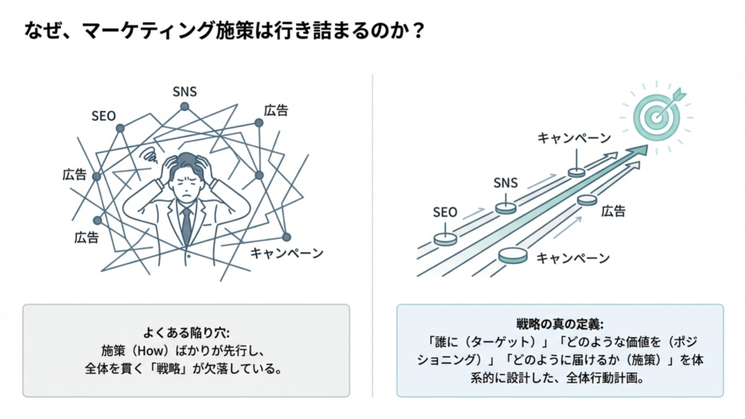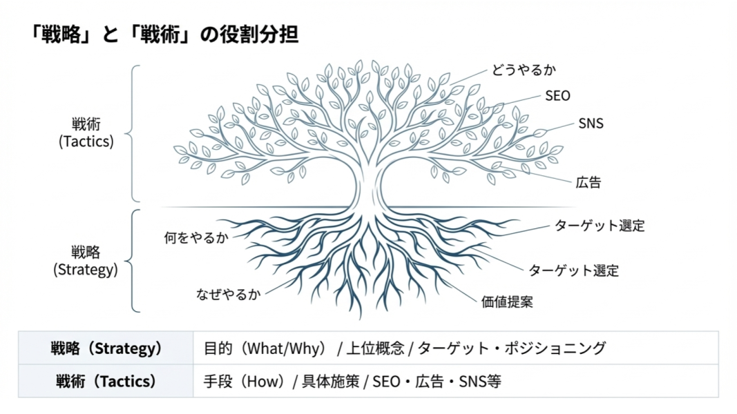 マーケティング戦略は「戦略」と「戦術」の2つのレベルで構成されます。戦略は「何をやるか」「なぜやるか」を決める上位概念であり、戦術は「どうやるか」の具体的な施策です。SEO、広告、SNSといった個別施策は「戦術」にあたり、これらの前提となる方向性を決めるのが「戦略」です。