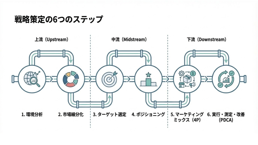 マーケティング戦略の立て方は、「環境分析→市場細分化→ターゲット選定→ポジショニング→マーケティングミックス→実行と改善」の6ステップで進めます。