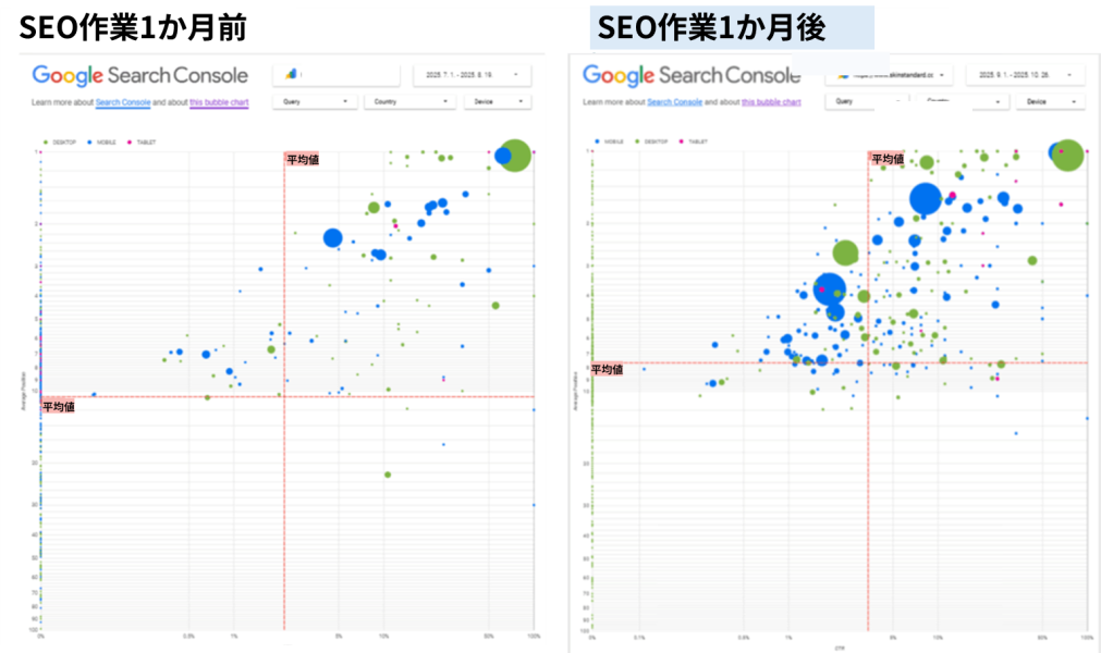 公開前後の平均値ラインを比較すると、グラフ全体が右上方向(順位上昇 × CTR上昇)に移動していることが分かります。これは、公開したコンテンツがより多く上位表示され、より多くクリックされるようになったという、SEOとして理想的な変化が起きていることを意味します。