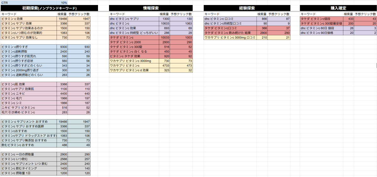 各段階ごとに、キーワードをトピック別に色分けし整理すると、各カテゴリーがどの程度の検索需要を持っているか、そして上位表示された場合にどれだけの流入が期待できるかが明確になります。これは、SEO戦略におけるどのキーワードから攻めるべきか、どのカテゴリのコンテンツ投資が最も効率的かを判断するための重要な材料となります。