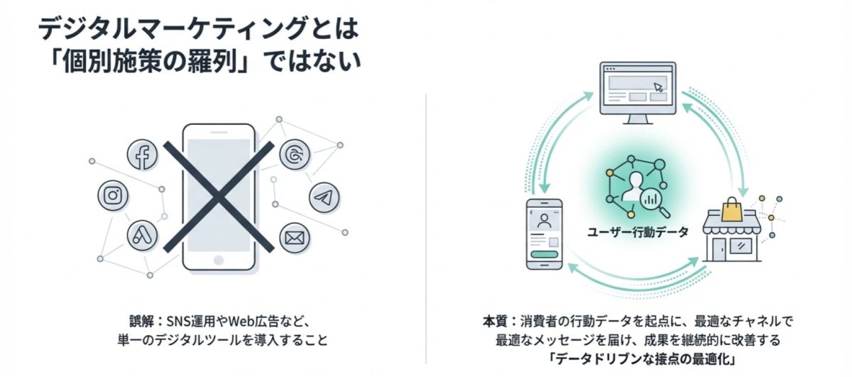 デジタルマーケティングは、単にSNSや広告を運用することではありません。消費者の行動データを起点に、最適なチャネルで最適なメッセージを届け、成果を継続的に改善していく、データドリブンなマーケティングの総称です。