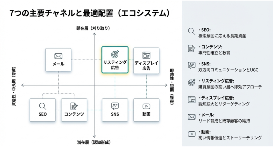 - SEO・SNS・広告・メールなど主要チャネルの特徴と使い分け