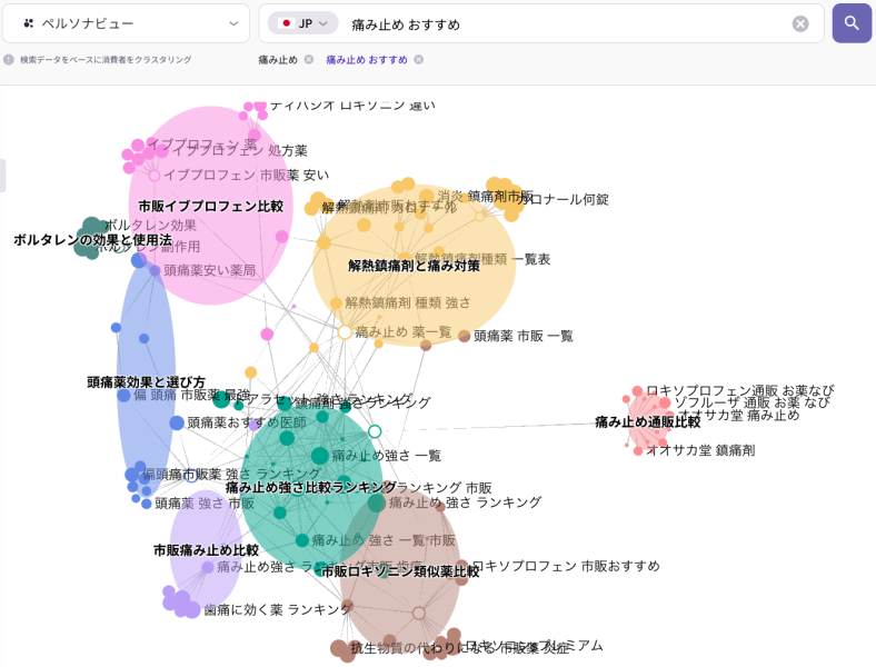ペルソナ設計では、属性情報だけで顧客を捉えるのではなく、消費者がどのような課題を抱え、どのような検索語で情報収集を進めているかまで把握することが重要です。実際の行動データに基づいて顧客理解を深めることで、より実態に即したジャーニー設計がしやすくなります。<ペルソナビューの機能紹介>