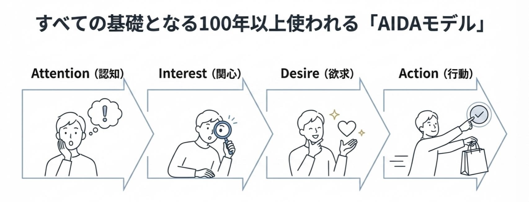 - 基本はAIDAモデル:認知→関心→欲求→行動の4段階