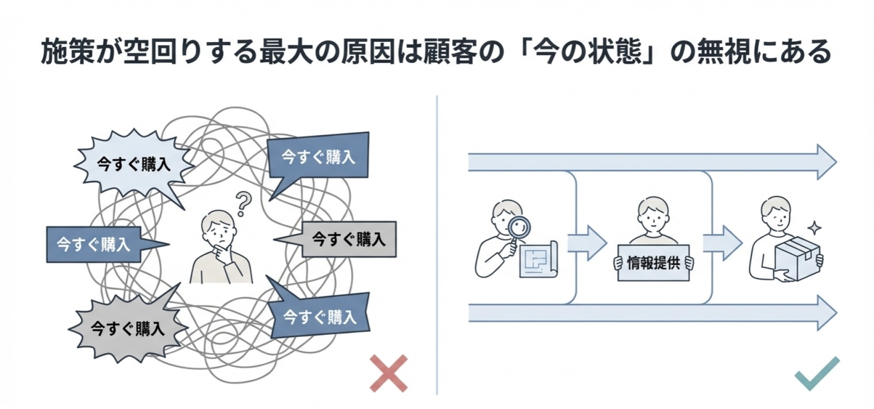 広告、SNS、SEO記事と、やることは増えているのに売上が伸びない。その原因の多くは、「顧客が今どの段階にいるか」を無視して施策を打っていることにあります。認知すらされていない顧客に購入を促す広告を出しても、効果は出ません。逆に、すでに購買意欲が高い顧客に認知施策を当て続けても、機会を逃すだけです。