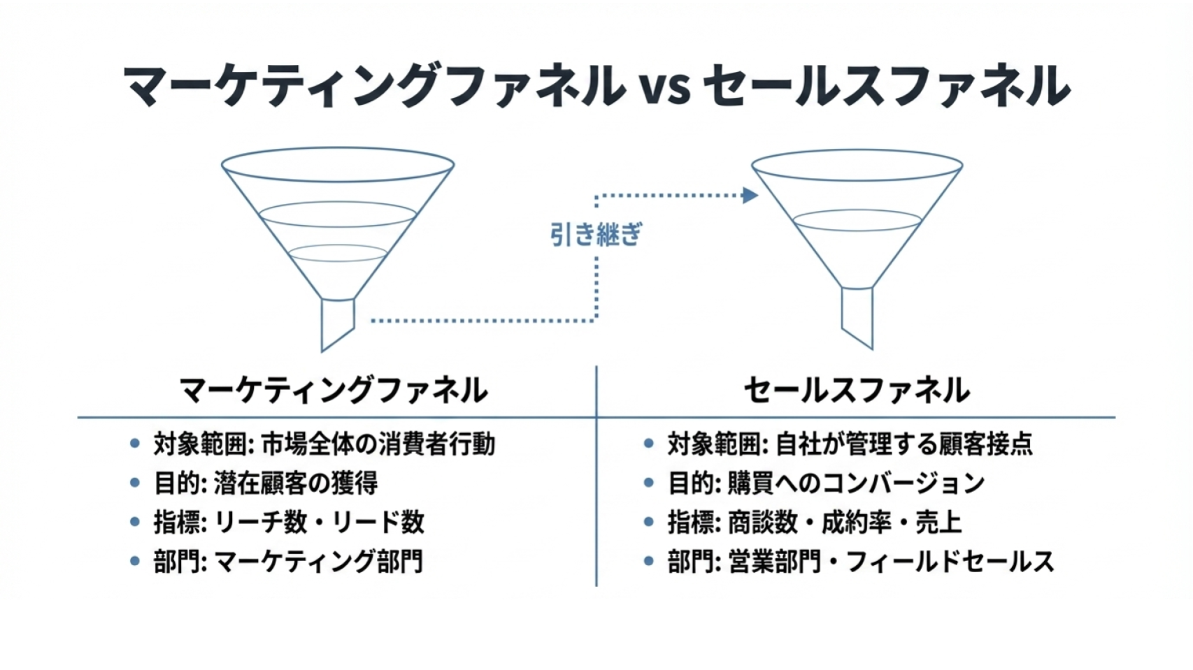 2つのファネルの役割の違いと、部門を跨いだ連携の設計方法を解説しています。