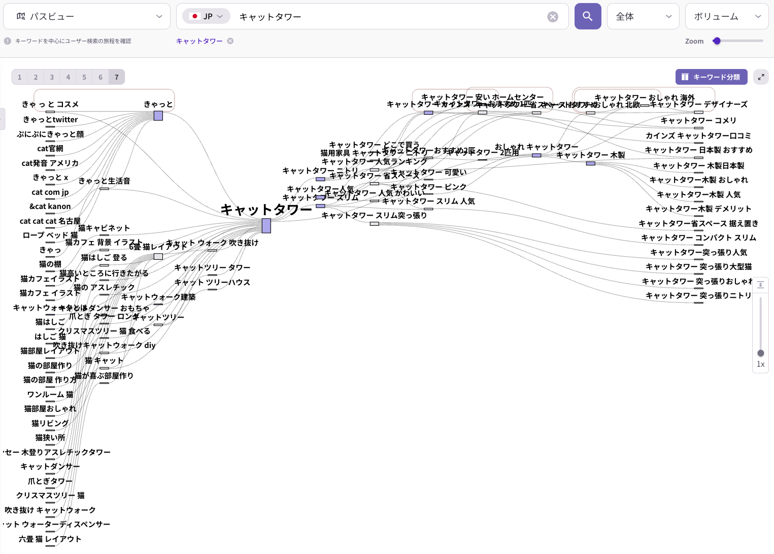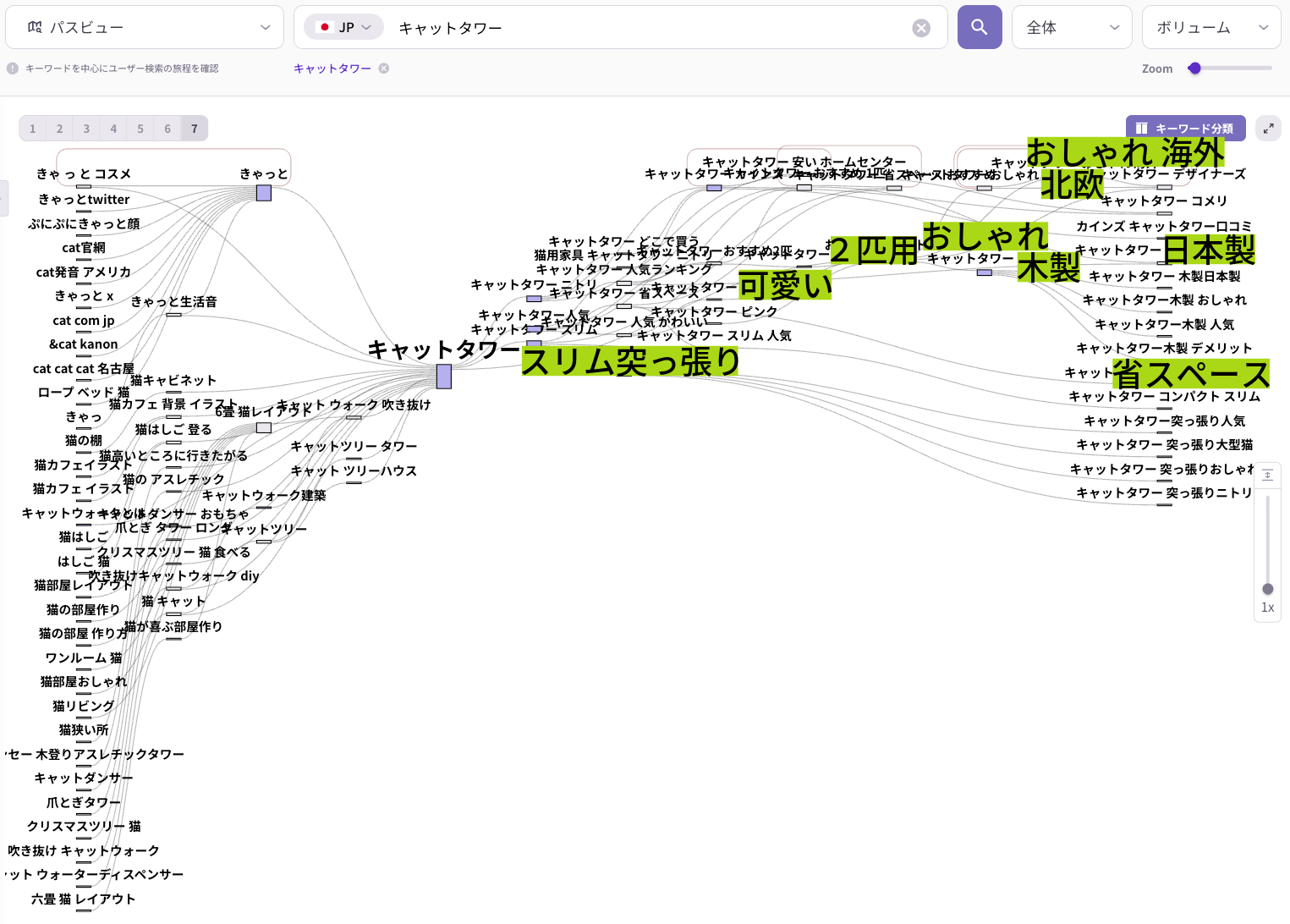 顧客がどの段階にいるかをより正確に把握するには、実際の検索行動データが有効です。たとえばキャットタワーでは、ListeningMindで検索パスを確認すると、まず「キャットタワー」といった一般的な検索から入り、その後「おしゃれ キャットタワー」「キャットタワー 木製」や「キャットタワー スリム」「キャットタワー 省スペース」のように、具体的な比較・検討キーワードへと検索が進んでいく様子が見えてきます。このように、どのようなキーワードをどの順序で検索しているかを分析することで、顧客が認知段階にいるのか、比較検討段階に進んでいるのかを推定しやすくなります。<パスファインダーの機能紹介>