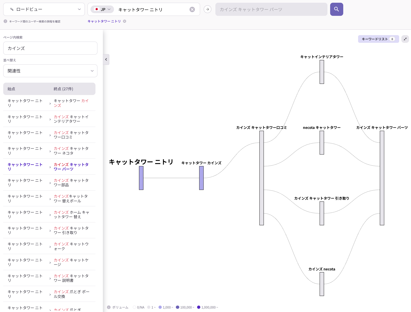 ListeningMindのロードビューを見ると、「キャットタワー ニトリ」で情報収集を始めたユーザーが、その後「キャットタワー カインズ」や「カインズ キャットタワー 口コミ」「カインズ キャットタワー パーツ」などの検索へ移行していることが確認できます。これは、特定ブランドへの関心で検索が完結するのではなく、購入前の比較検討の中で他社ブランドや関連情報へ探索が広がっていることを示しています。こうした検索の分岐を把握することで、ブランド比較、口コミ、パーツ情報といった検討段階で必要とされるコンテンツをより具体的に設計しやすくなります。<ロードビューの機能紹介>