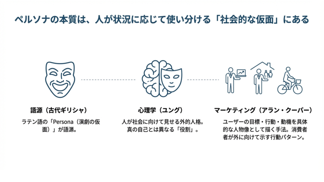 - ペルソナの語源は古代ギリシャの「仮面」で、心理学・マーケティング・UXデザインで使われる