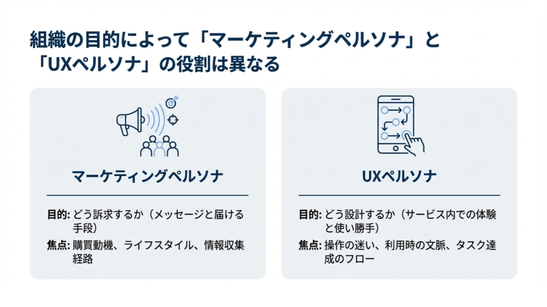 マーケティングペルソナとUXペルソナは、目的が異なります。マーケティングペルソナが「どう訴求するか」の判断基準であるのに対し、UXペルソナは「どう設計するか」の判断基準です。