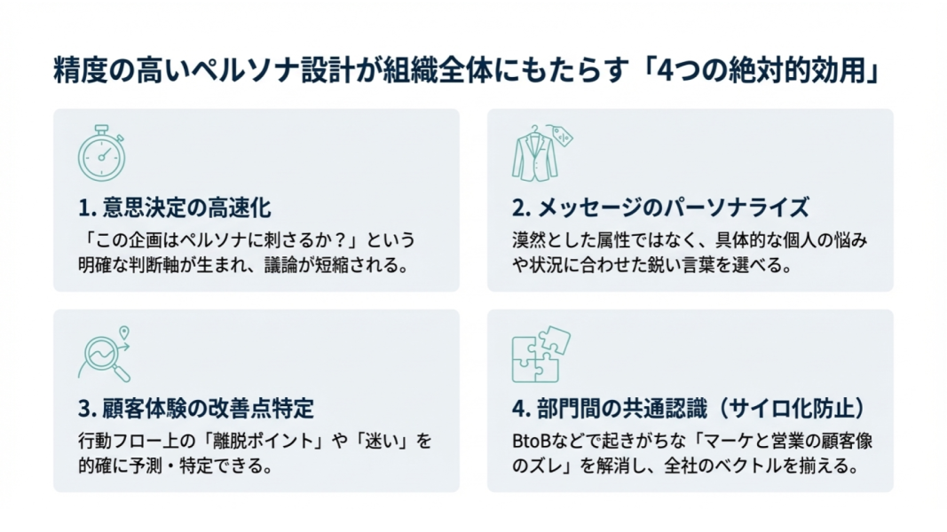 ペルソナを設定することで、「誰に・何を・どのように伝えるか」が明確になり、マーケティング施策全体の一貫性と精度が大幅に向上します。