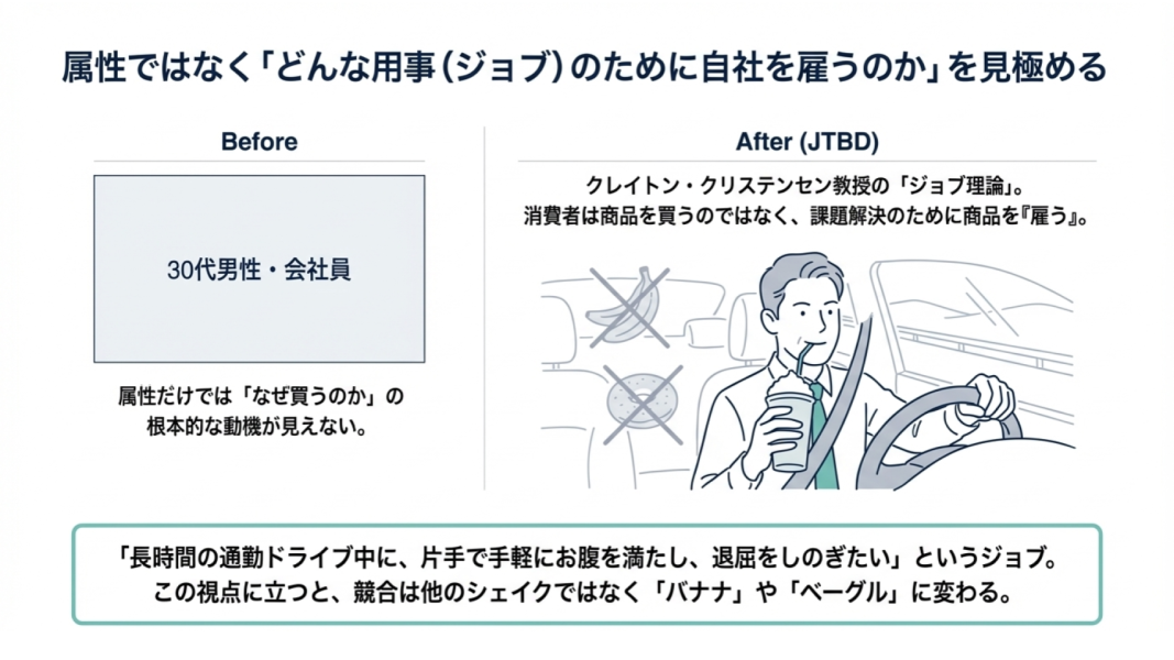 この視点でマーケティングを考えると、競合は「他のミルクシェイクブランド」ではなく「バナナ」「コーヒー」「ベーグル」になります。ジョブが明確になると、競合の定義と訴求メッセージが根本的に変わります。
