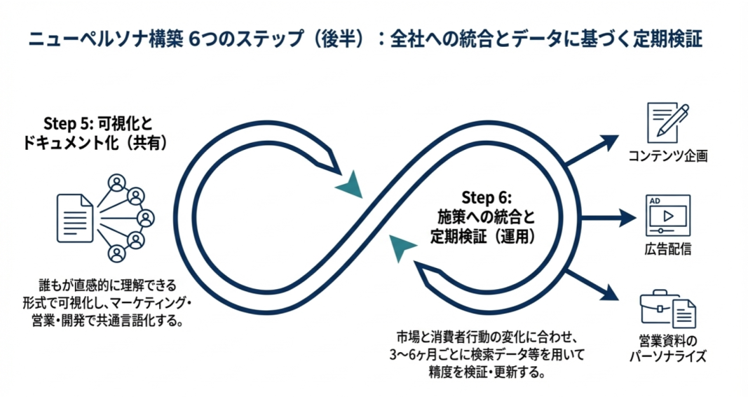 - 作成の6ステップは「データ収集→整理→数の決定→詳細描写→可視化→施策統合」