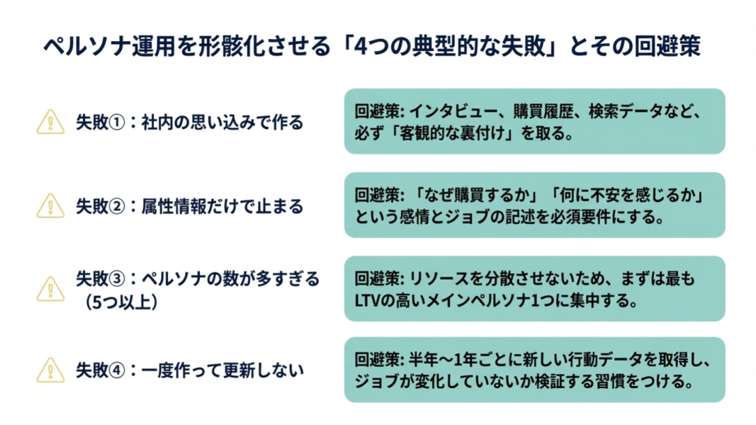 ペルソナ作成における失敗の多くは、データではなく主観で作ることと、作成後に活用されないことです。