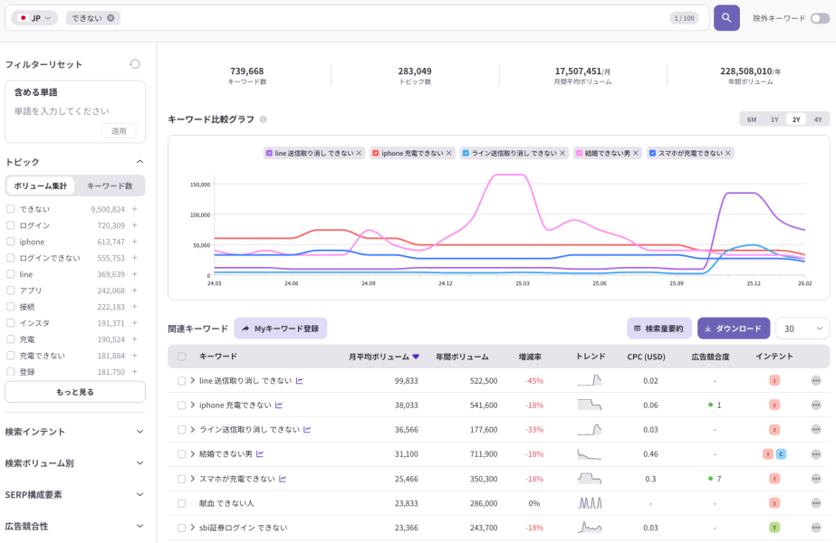 【ヒント】ペルソナの定期更新時に「市場の消費者行動がどう変化しているか」を確認することが重要です。ListeningMindの過去比較機能であれば、3〜12ヶ月前の検索行動と現在を比較し、ペルソナのジョブや課題が変化していないかをデータで検証できます。<過去比較機能の紹介>