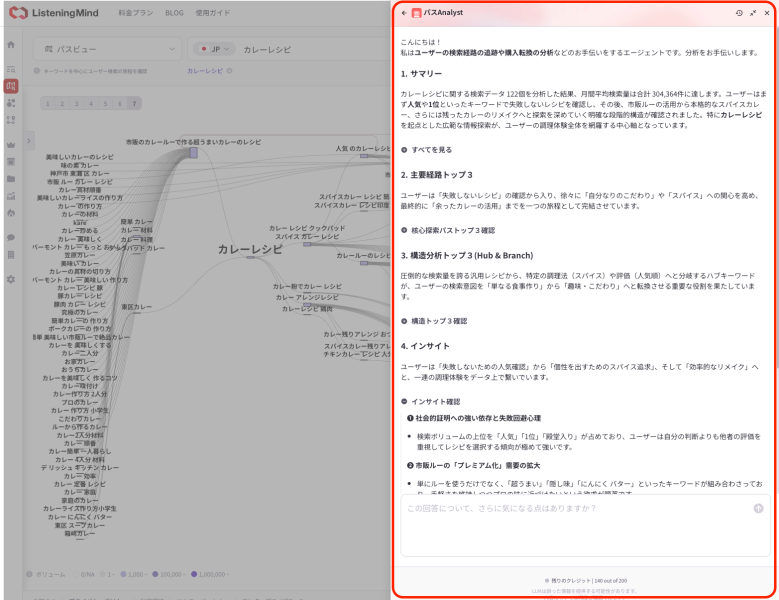 【ヒント】ペルソナのジョブを特定するうえで最も有効なのが、検索キーワードの「前後の流れ」を見ることです。ListeningMindのパスファインダーであれば、消費者がどのキーワードから始まり、どのように検索語を変化させたかを可視化できるため、「この人は何を解決しようとしていたのか」が経路から読み取れます。<パスファインダーの機能紹介>