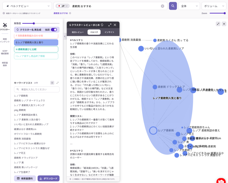 たとえば ListeningMind のペルソナビューで「柔軟剤 おすすめ」を分析すると、大きな関心グループの中に「レノア柔軟剤人気と香り」といったサブグループが見えてきます。さらにこのグループをAIレビュー機能で読み解くと、同じ「レノア柔軟剤」に関心を持つ人でも、実際には次のような複数のペルソナに分かれていることがわかります。