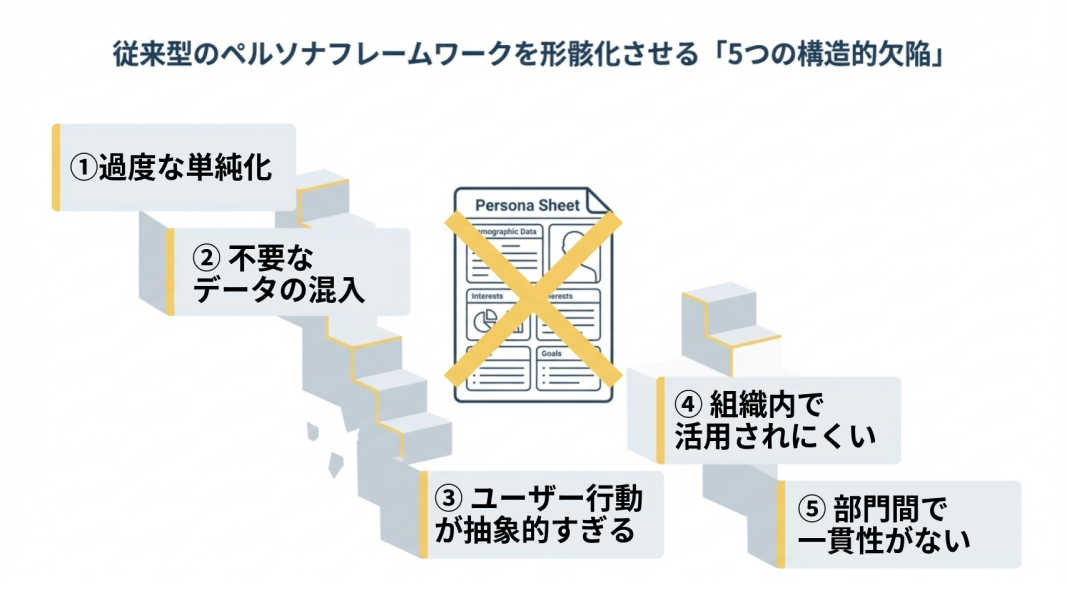 - 従来のペルソナには「過度な単純化」「抽象的すぎる行動分析」「組織内で活用されにくい」など5つの課題がある