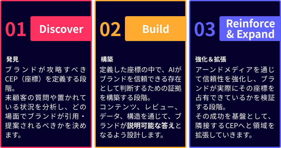 - GEO 3ステップ実行フレームワーク(Discover / Build / Reinforce)