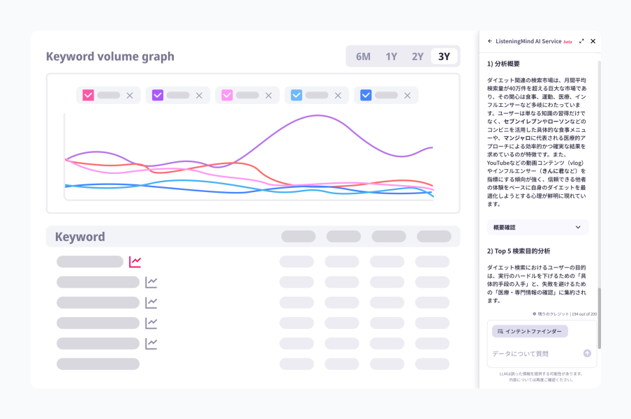 生成系LLMを活用し、ユーザーが閲覧中の分析画面をそのまま理解したうえで、キーワード、グラフ、検索フローのデータを横断的に解釈します。