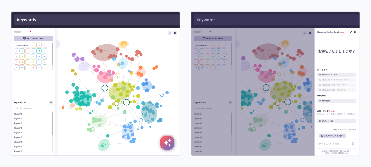 リスニングマインドAIエージェントは、右側のボタンを一度押すだけで、リスニングマインドに蓄積された膨大なデータを分析してくれるAI分析機能です。