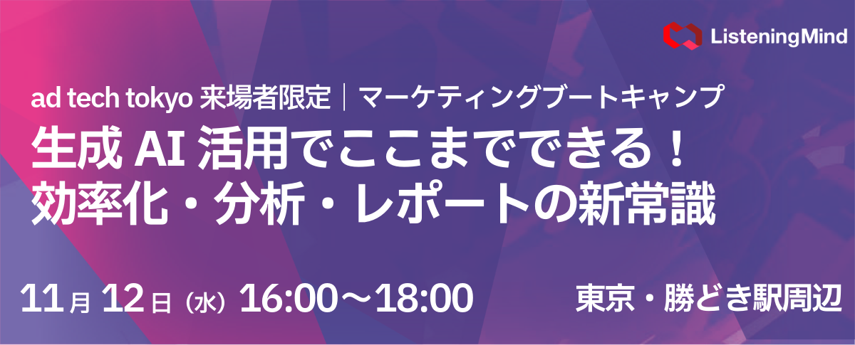 本セミナーでは、生成AIとListeningMindを活用し、データ分析からレポート作成までを効率化しながら、マーケティングスキルを着実にレベルアップさせる実践的な方法を紹介します。