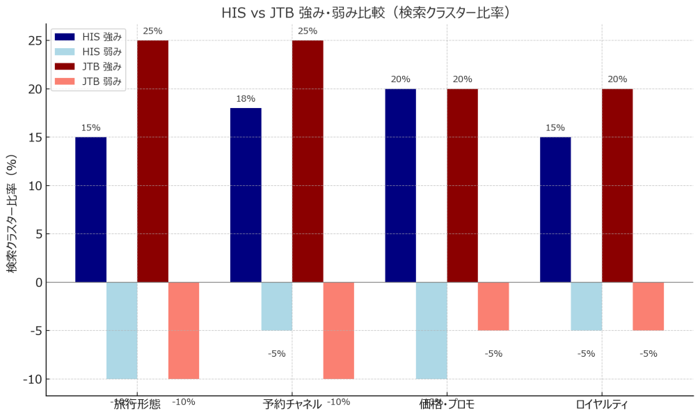 HIS vs JTB:強み・弱み比較(クラスタ比率に基づく定量評価)