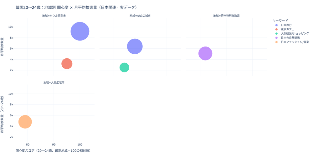 韓国のZ世代(20〜24歳)は、日本旅行、カフェ、ファッションといったライフスタイル関連のキーワードに高い関心を示し、購買力とSNSでの拡散力を持っています 。地域別・年齢別の関心度を定量化することで、「誰に、どこで、どのテーマで」訴求すべきかを明確にできます 。